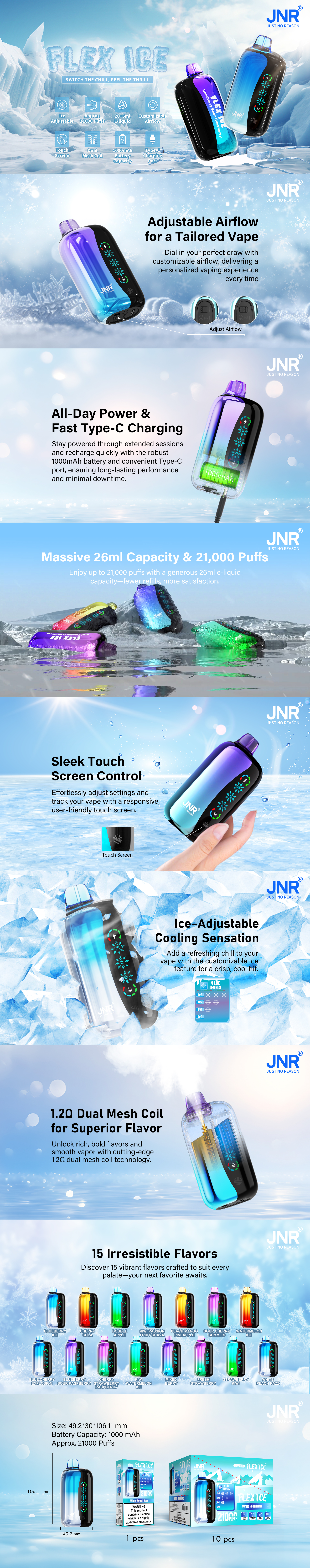Available in 15 vibrant flavors, the JNR Flex Ice is perfect for vapers who want performance, customization, and style in one sleek device.