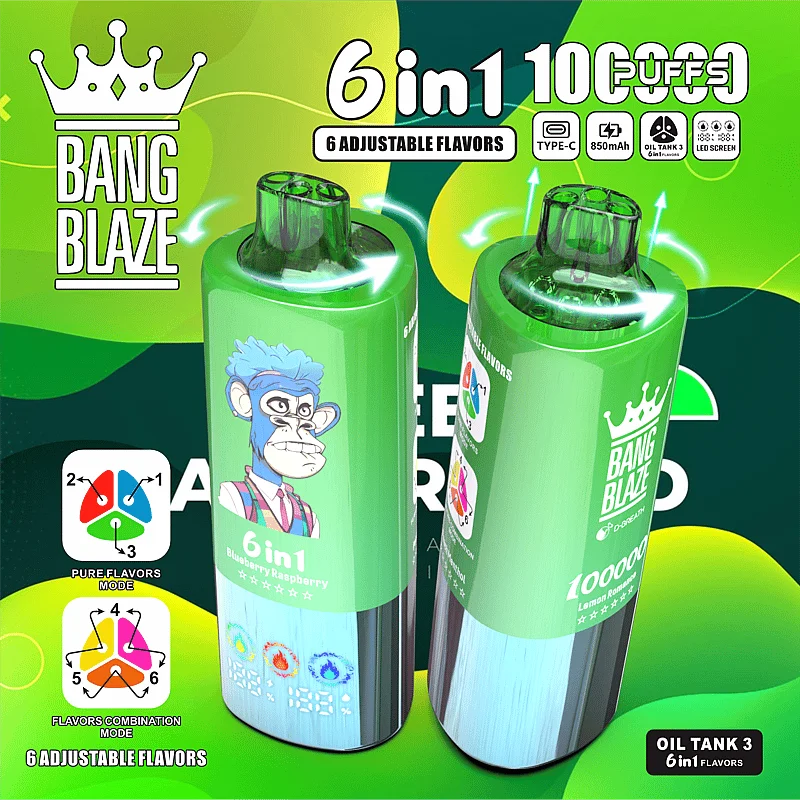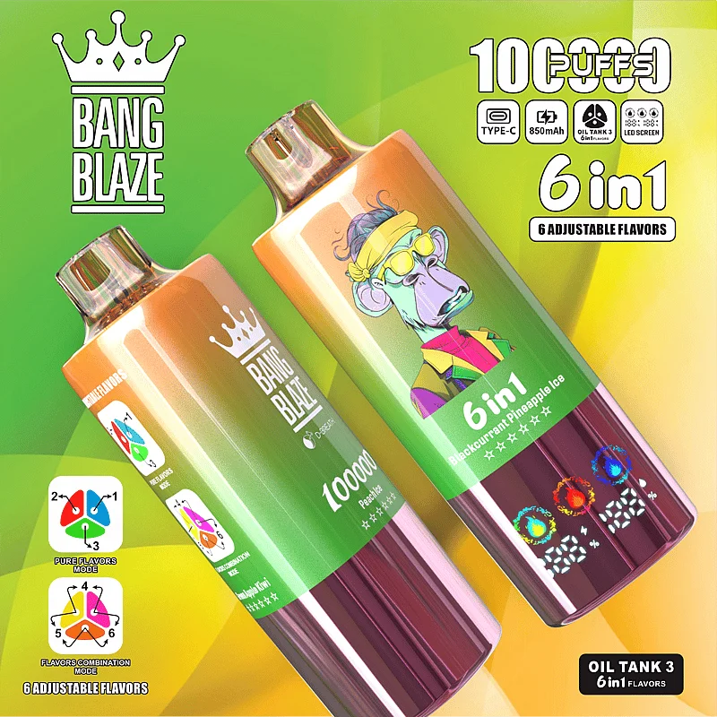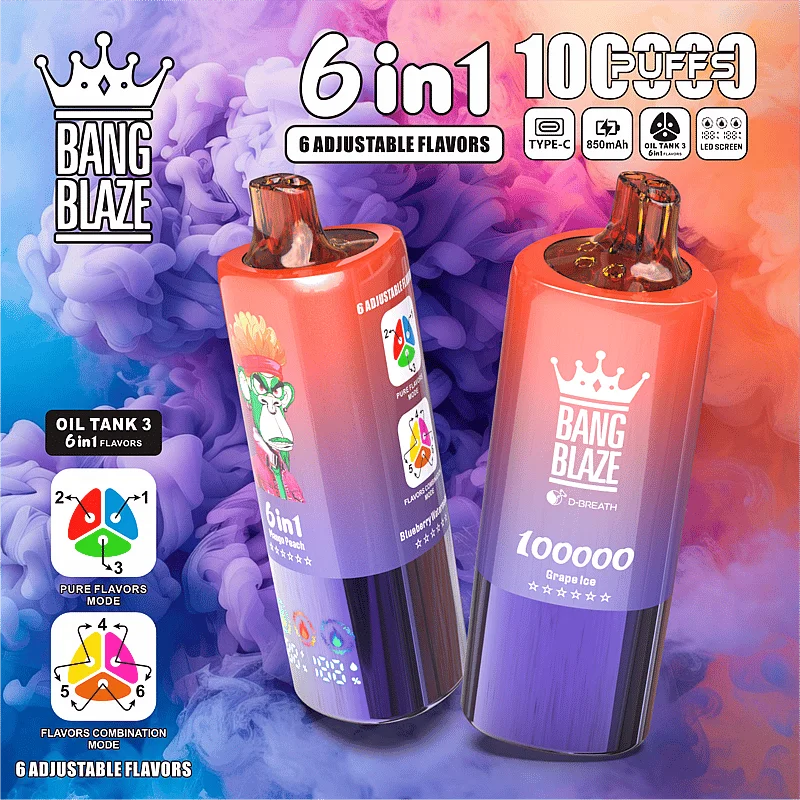 The Bang Blaze 100K Puffs 6 in 1 Flavors Disposable Vape delivers an impressive 100,000 puffs with six flavor modes including single and mixed options(A, B, C, A+B, A+C, B+C). Featuring 3 oil tanks, a powerful 850mAh rechargeable battery, and an advanced triple mesh coil, it ensures rich flavor and dense clouds. The bright LED screen displays vital vaping data, while the Type-C charging port offers quick, efficient recharging. Packed 10 pcs per pack and available in 10 premium flavors, it’s the perfect choice for long-lasting, versatile vaping.