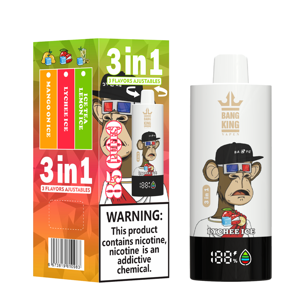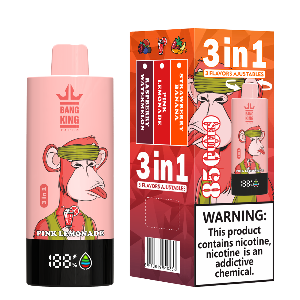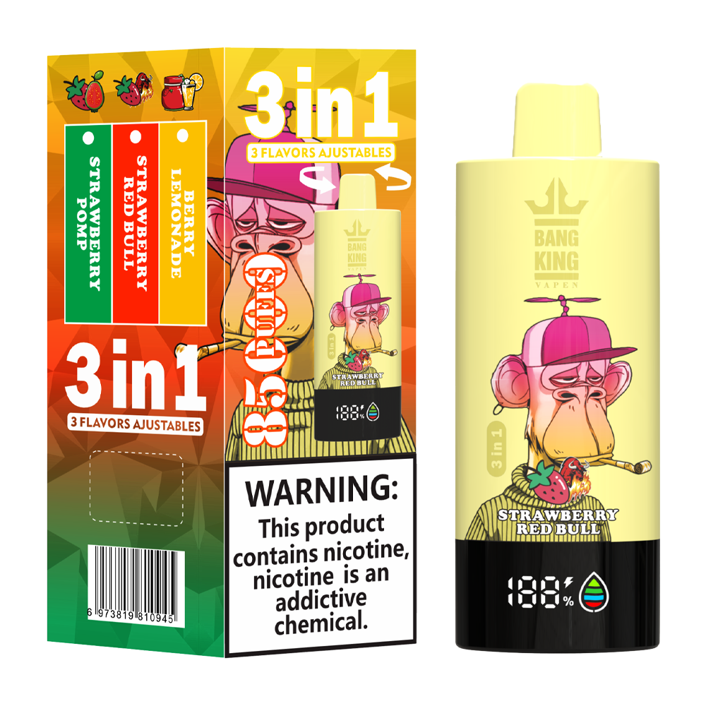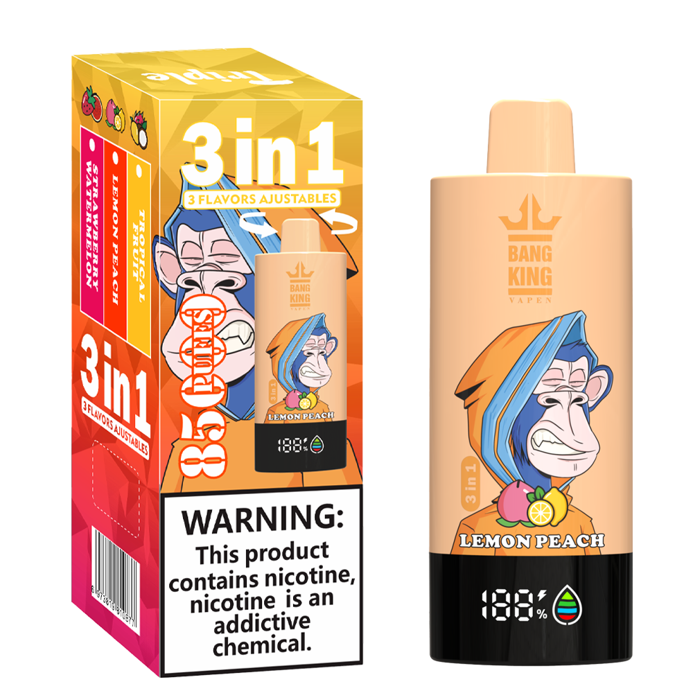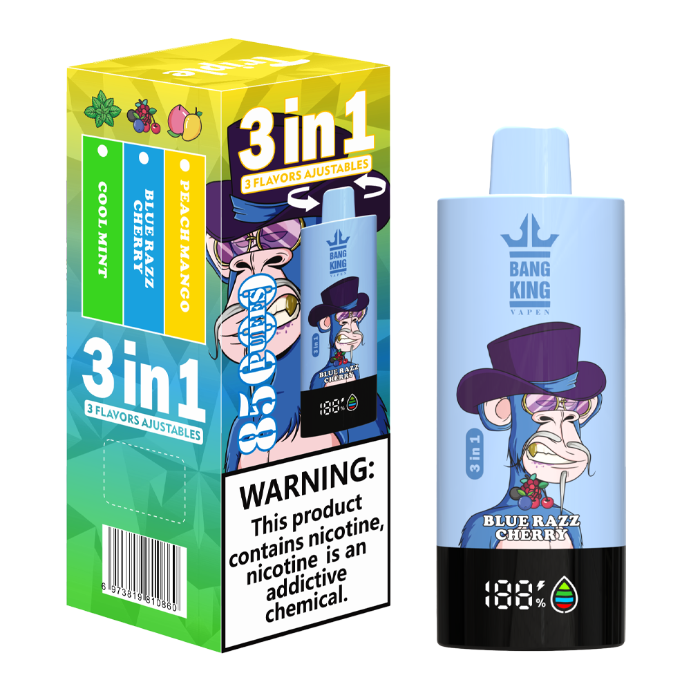 Bang King 85000 disposable vape delivers an impressive 85000 puffs, designed for vapers who want variety and endurance in one device. Featuring three adjustable flavors with a total e-liquid capacity of 63mL (3 × 15mL pods), this device allows seamless switching between flavors to keep every puff exciting.
